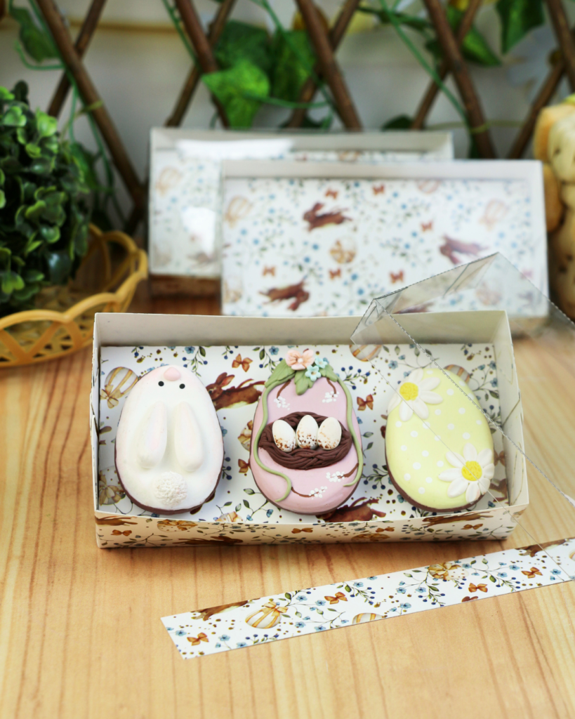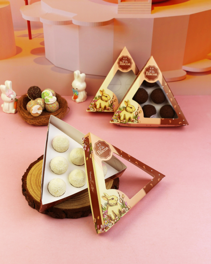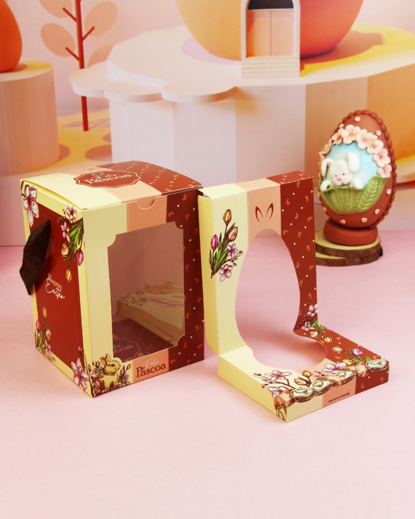 Use caixas estruturadas, com berço interno e firmeza. Elas mantêm o ovo no lugar e evitam impactos durante o delivery de Páscoa.