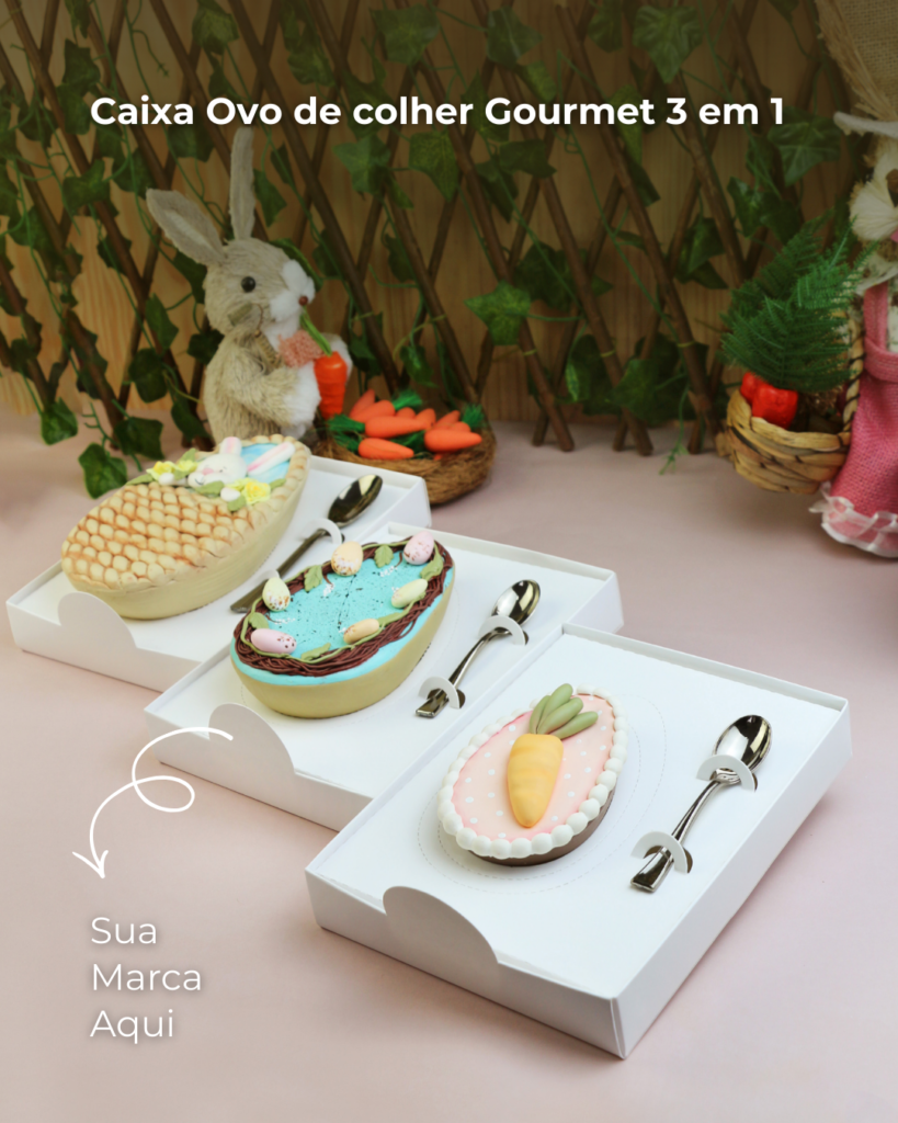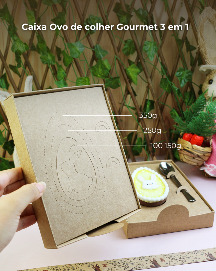 Use a Caixa Ovo de Colher 3 em 1 da Empório Box, com um único modelo de embalagem, você consegue atender a três demandas diferentes: 100/150g | 250g 350g :
