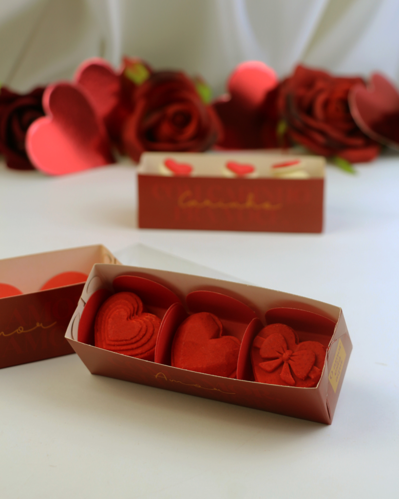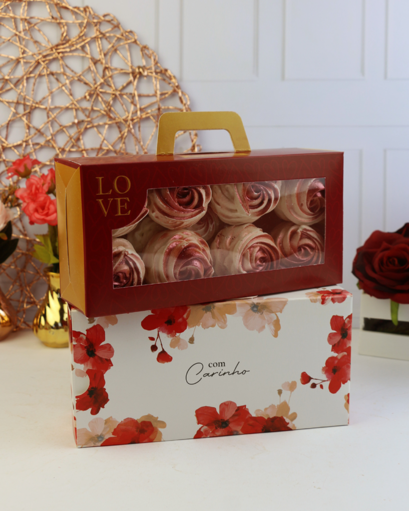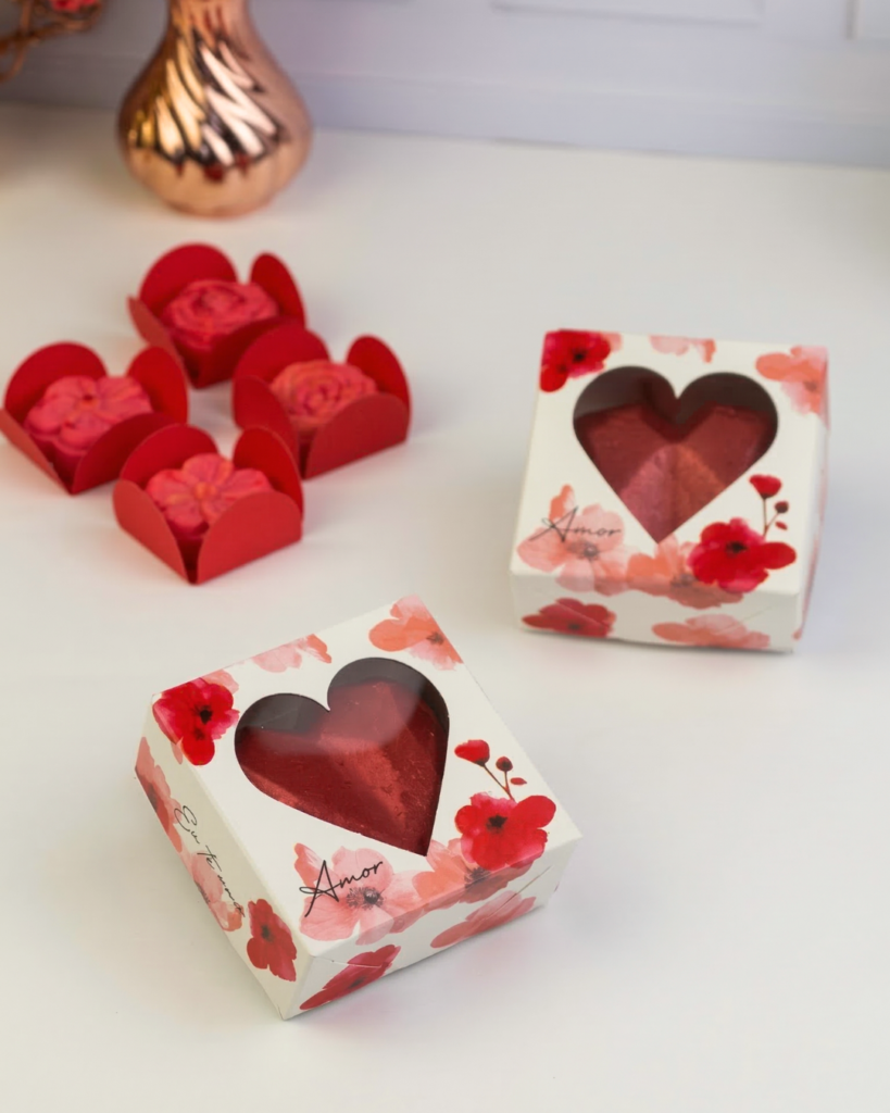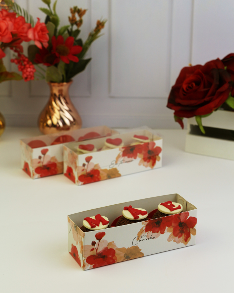 Caixas com visor, principalmente em formato de coração, seguem como tendência forte, porque mostram o capricho do doce antes mesmo de abrir.